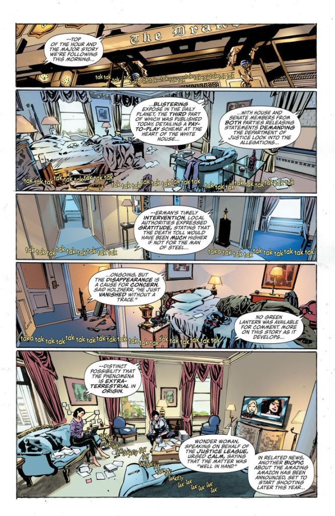 Don’t get me wrong, I’m very glad to see Renée Montoya, and initially it felt like she was being used properly, but I don’t know a thing about the continuity her arc was tied to and nothing was revealed even in editorial boxes. I’d love to see a Question mini or ongoing featuring her, but effectively shoehorning one in here resulting in Lois launching an organisation for helping DC characters whose stories have been fractured by various Crises made little sense. There must have been a better parallel with Central American asylum seekers’ lives similarly interrupted by Trump. Surely the priority could have remained Lois walking us through just America’s journalism problems in the DC Universe, rather than justifying the revelation of the multiverse to the public ‘because journalism’? The conversation she has with Renee about the importance of the truth was powerful, but undermined by the confusing and excessively vast context Rucka sets it in.